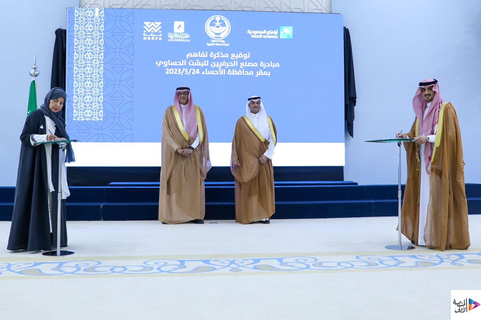 رعى صاحب السمو الملكي الأمير سعود بن طلال بن بدر محافظ الأحساء اليوم ” الأربعاء ” بمقر المحافظة ، توقيع ارامكو السعودية لمذكرة تفاهم مع جمعية فتاة الأحساء التنموية الخيرية وجمعية حرفة التعاونية لتنفيذ مبادرة لدعم الحرفيين لإنشاء مصنع حرفي لصناعة البشوت ( البشت الحساوي ) بمحافظة الأحساء ، وذلك لتأهيل 100 شاب وفتاة على مهارات تصنيع البشوت يدوياً وصناعياً والذي سيؤسس لنقله نوعية في انتاج البشوت ومنافذ بيعها وتسويقها ، وتجول سموّه في معرض البشت الحساوي والذي أقيم في فندق الانتركونتنتال ، مستمعاً سموّه لشرح عن طريقة تصنيعه يدوياً وصناعياً