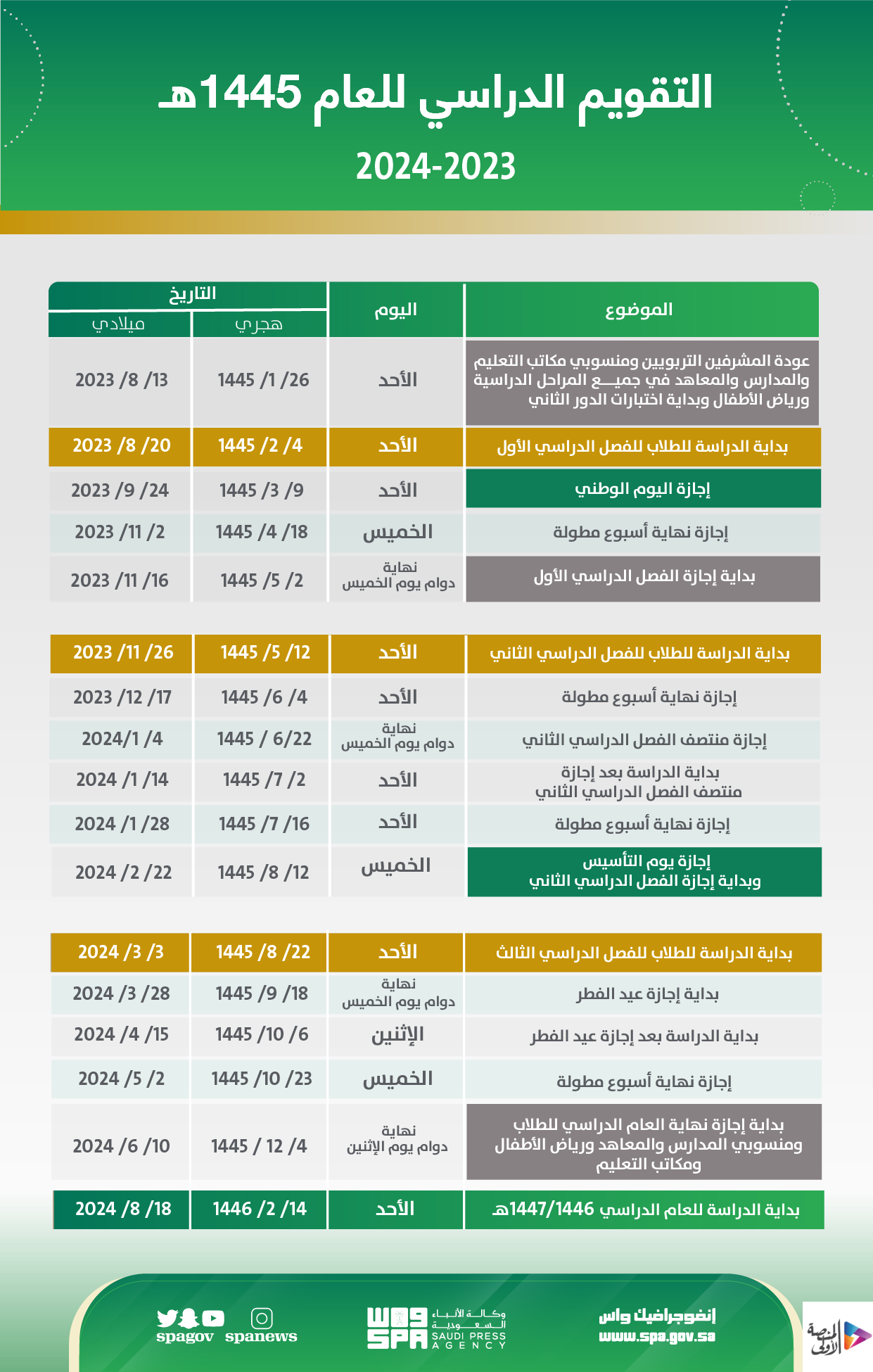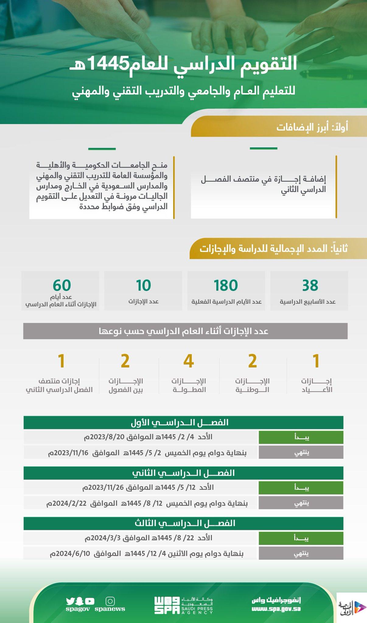 ويمنح التقويم الدراسي للعام 1445ھ الجامعات الحكومية والأهلية والمؤسسة العامة للتدريب التقني والمهني، والمدارس السعودية في الخارج ومدارس الجاليات مرونة التعديل وفق ضوابط محددة، كما جرى تحديد بداية الدراسة للعام الدراسي 1446 / 1447 هـ يوم الأحد 14 / 2 / 1446هـ الموافق 18 / 8 / 2024م.