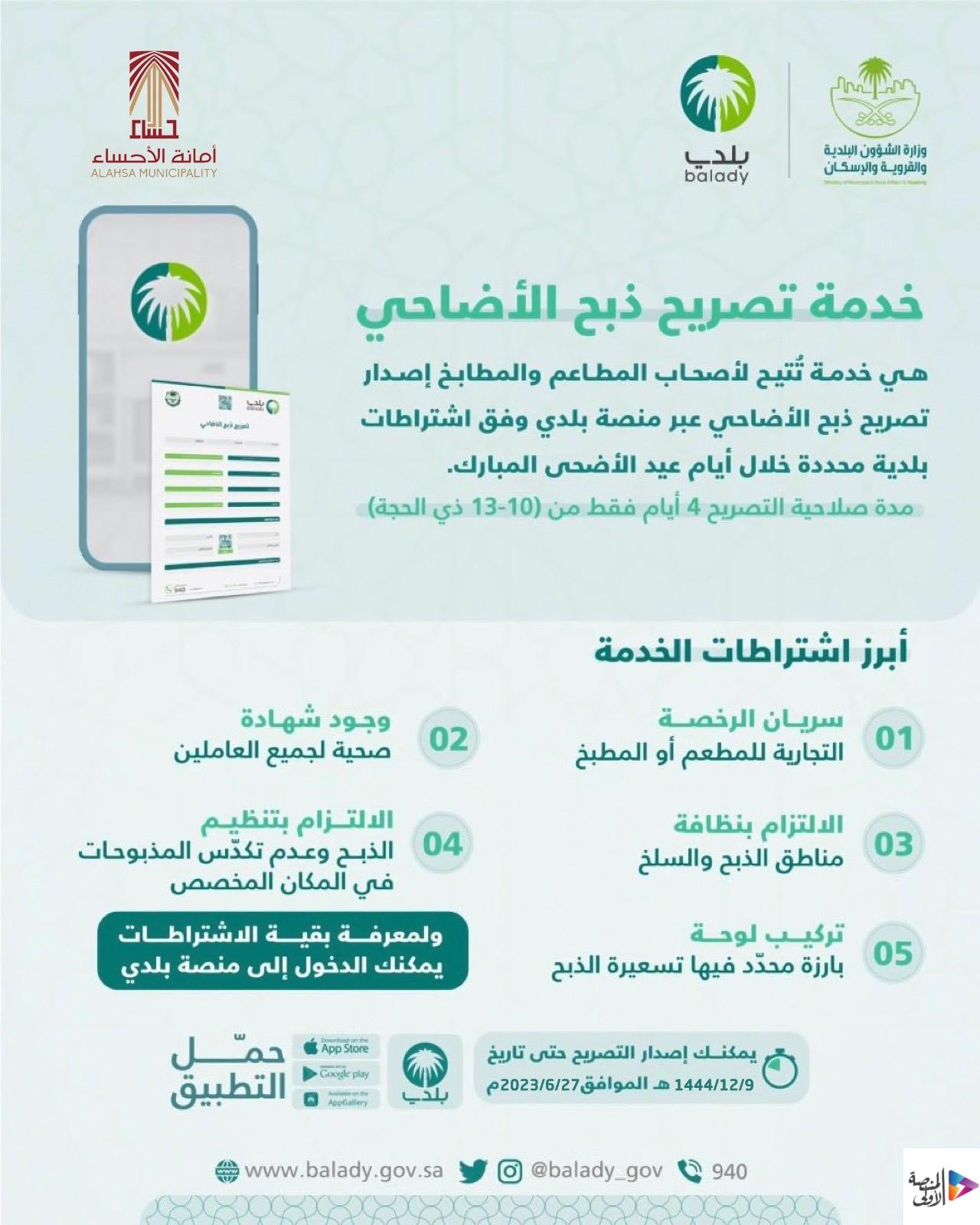 أتاحت أمانة الاحساء خدمة التقديم على إصدار التصاريح الالكترونية لذبح الاضاحي في المطابخ والمطاعم الاهلية عبر منصة ” بلدي” لمدة 4 أيام من عيد الأضحى المبارك ( 10-13 ذوالحجة / 28يونيو-1يوليو) وفق اشتراطات بلدية محددة ، وسيكون التقديم على الخدمة متاحاً حتى تاريخ 9ذوالحجة ” 27 يونيو 2023″ .