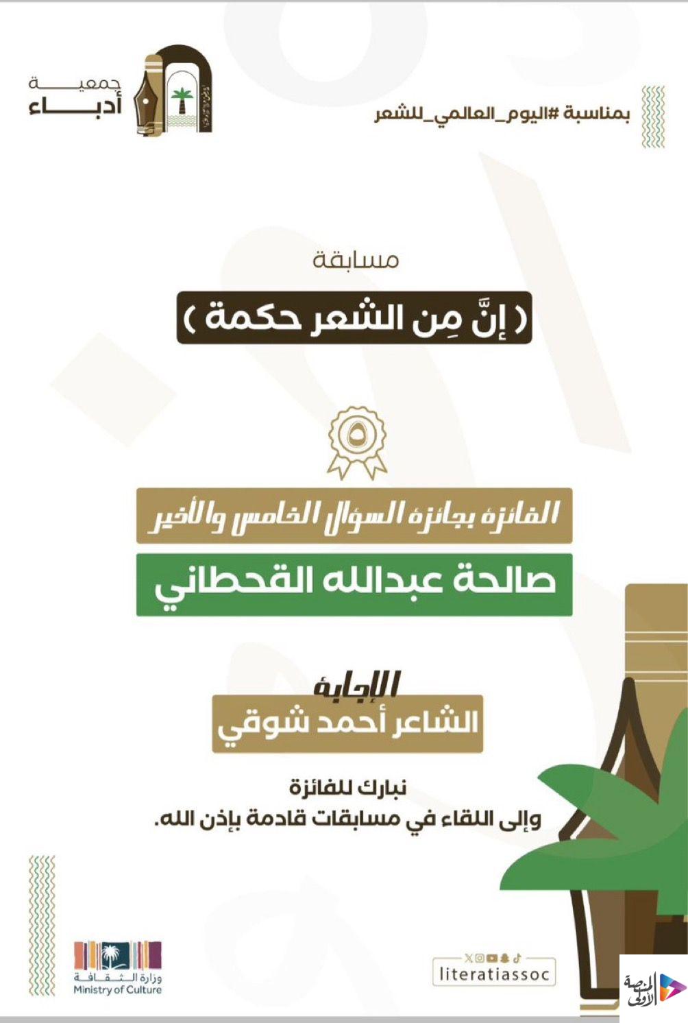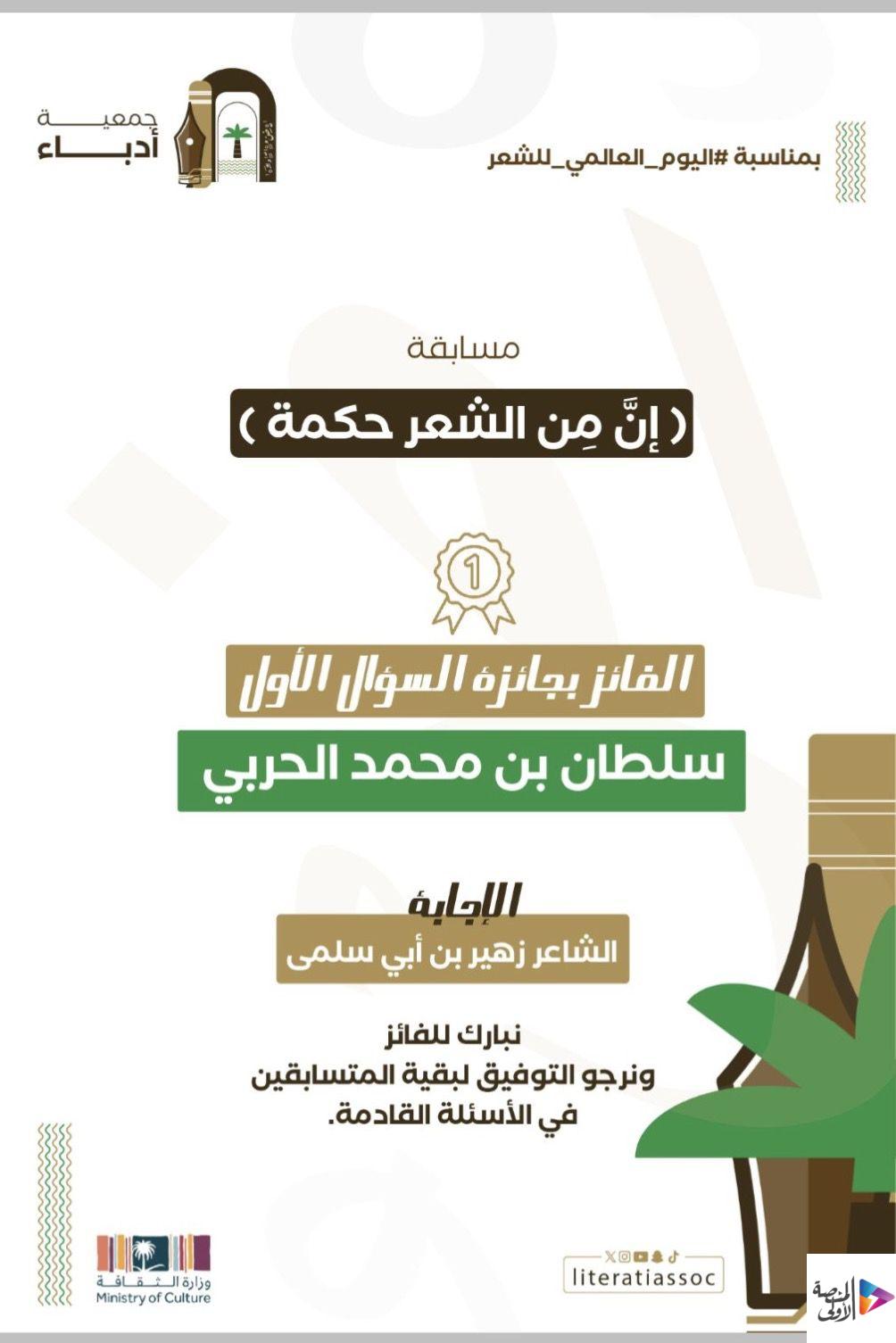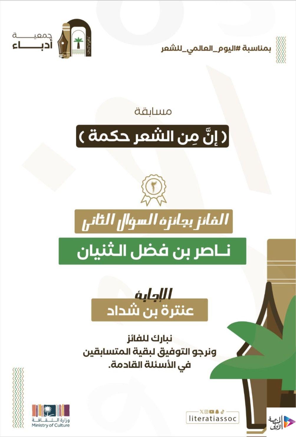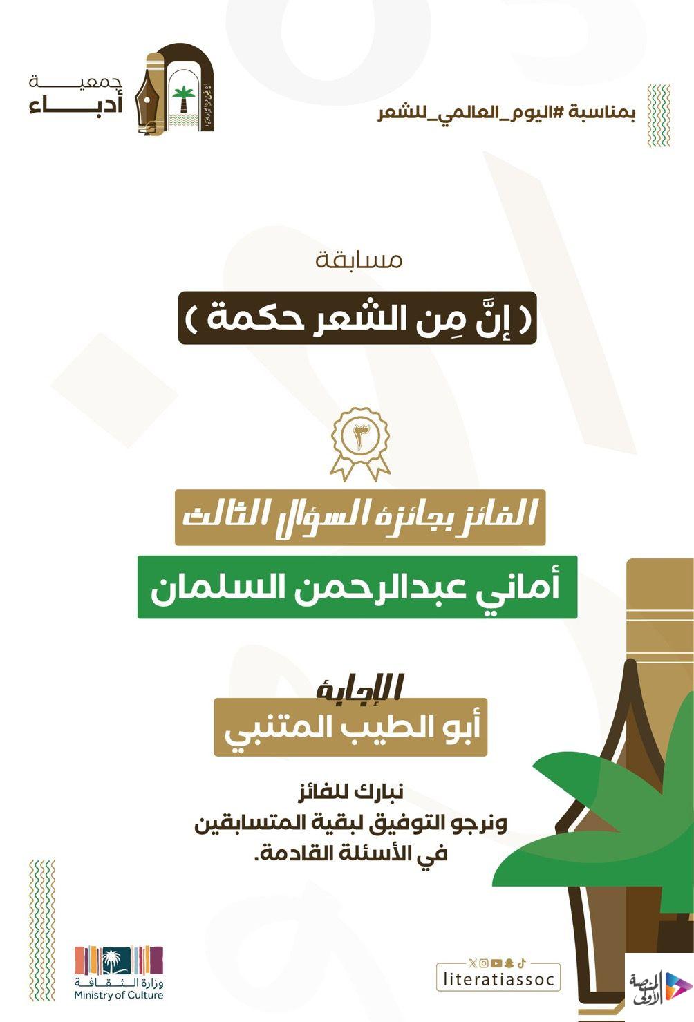 اختتمت جمعية أدباء في الأحساء مسابقتها الشعرية ( إن من الشعر حكمة ) والتي أطلقتها بمناسبة اليوم_العالمي_للشعر وضمن فعاليات مجلس الأنس الأدبي بهدف تشجيع ناشئة الأدب على العودة للتراث الأدبي، وتنمية ذائقتهم بقراءة الشعر العربي الأصيل وحفظ عيونه . والتي بدأت مساء يوم الأربعاء 17 رمضان الساعة العاشرة ، واستمرت خمس ليالٍ طرحت فيها خمسة أسئلة في خمس تغريدات واستقبلت الإجابات ردا عليها ، مقدمة خمس جوائز نقدية بقيمة ١٥٠٠ ريال، قيمة كل جائزة 300 ريال ( كل ليلة سؤال وفائز ) وأعلنت أسماء الفائزين وهم :