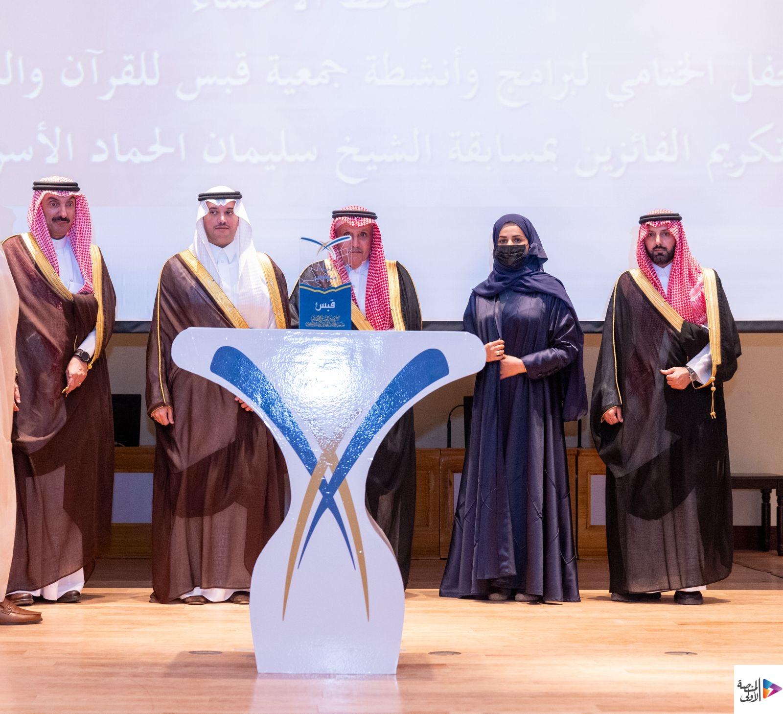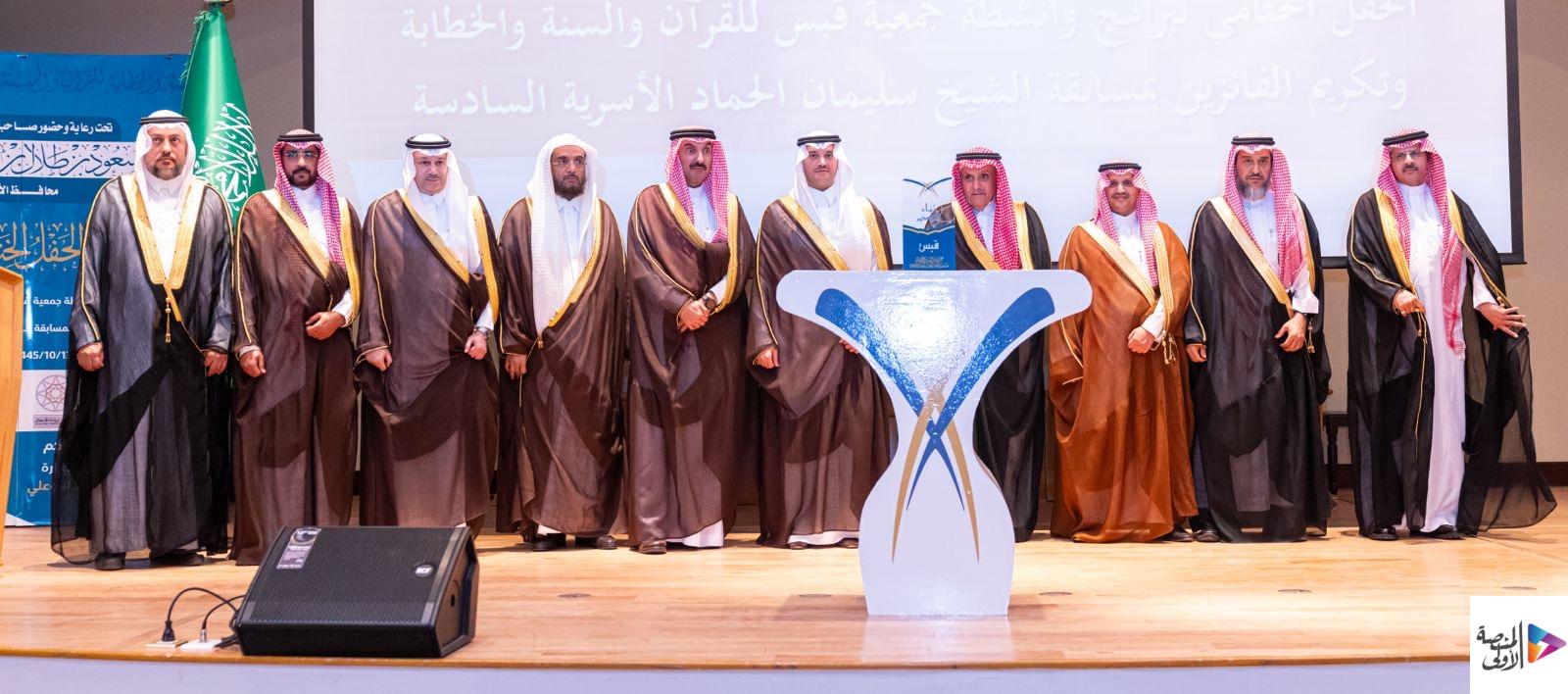 وكرّم سموّه الفائزين بمسابقة الشيخ سليمان الحماد الأسرية للقرآن والسنة والدورات القرآنية والداعمين ، والمتطوعين وبعض مدراء الجهات الحكومية والخاصة الذين أسهموا في نشاطات جمعية الأمير محمد بن فهد بن جلوي (قبس) للقرآن والسنة والخطابة.