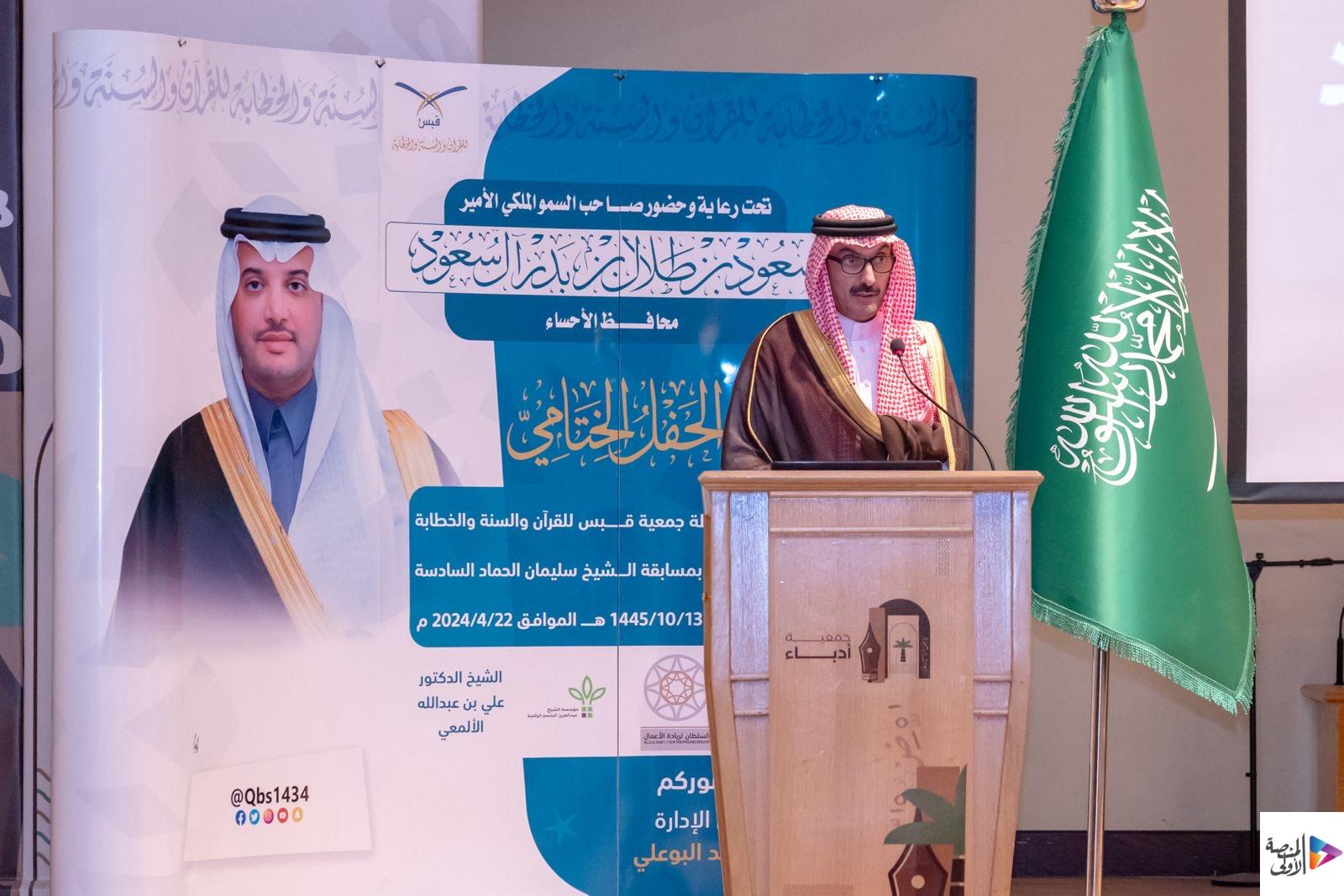 رعى صاحب السمو الملكي الأمير سعود بن طلال بن بدر محافظ الأحساء مساء اليوم ” الإثنين”، الحفل الختامي لفعاليات وأنشطة جمعية الأمير محمد بن فهد بن جلوي (قبس) للقرآن والسنة والخطابة، وذلك بجمعية أدباء، وبحضور أصحاب السمو والفضيلة والمعالي، وعدد من مسؤولي الجهات الحكومية والداعمين.