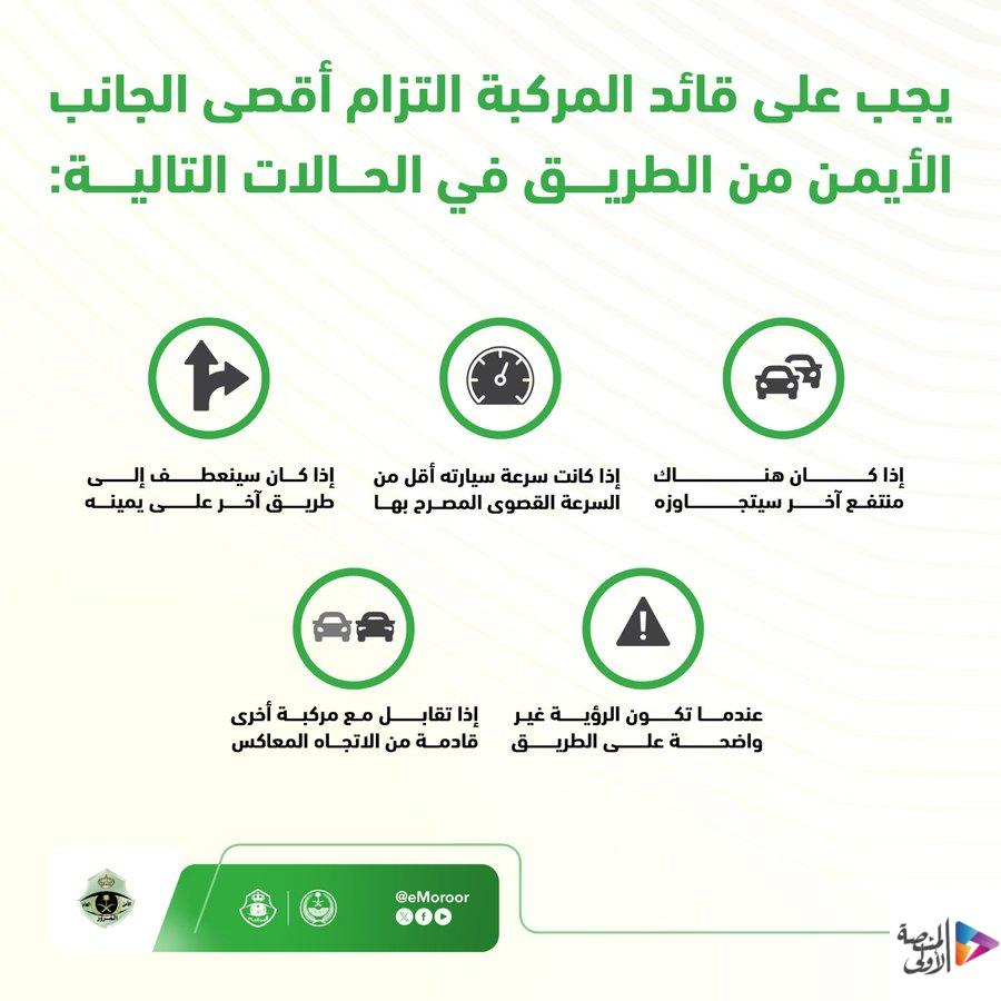 أوضحت الإدارة العامة للمرور، الحالات التي تلزم قائد المركبة بالبقاء على أقصى الجانب الأيمن أثناء القيادة على الطريق لتحقيق السلامة.
