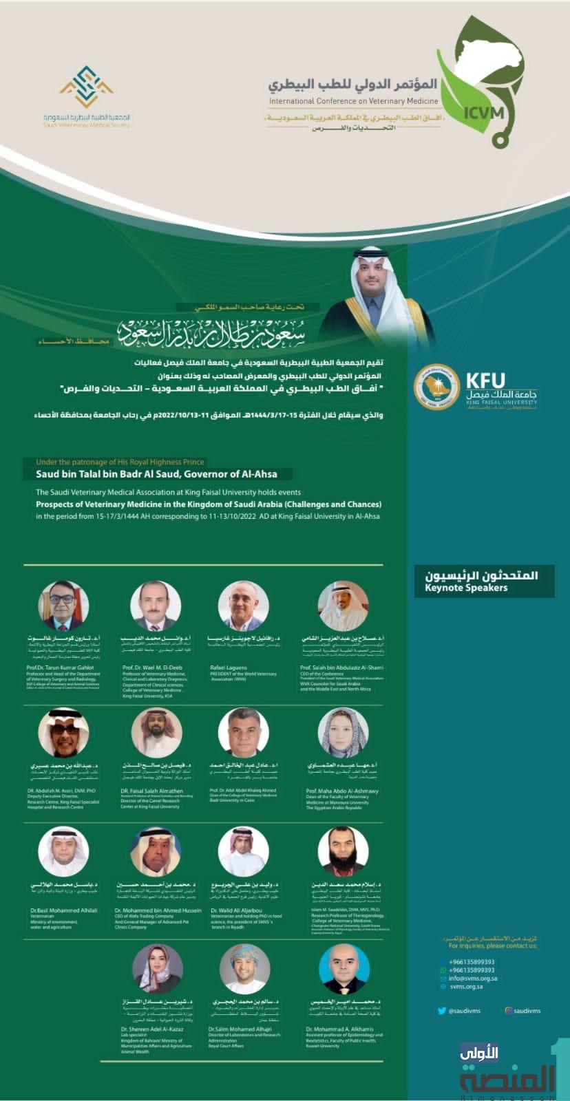 تحت رعاية صاحب السمو الملكي الأمير سعود بن طلال بن بدر آل سعود، محافظ الأحساء، تعقد الجمعية الطبية البيطرية السعودية في جامعة الملك فيصل مؤتمرها العلمي الأول بعنوان “آفاق الطب البيطري في المملكة العربية السعودية – التحديات والفرص”، الثلاثاء المقبل ولمدة 3 أيام في مقر الجامعة.