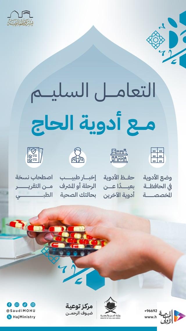 من ناحية ثانية، حثت وزارة الحج على ضرورة التعامل السليم مع أدوية الحاج، تجنبًا للمتاعب الصحية ولإكمال المناسك بيسر.