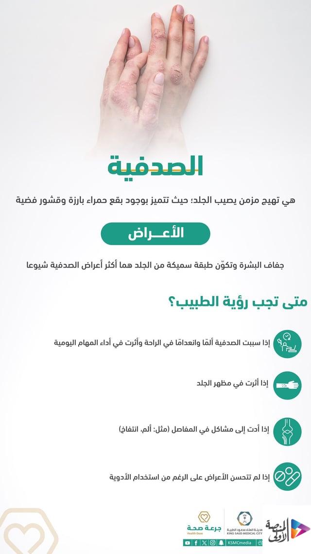 أوضحت مدينة الملك سعود الطبية أن مرض الصدفية عبارة عن تهيج مزمن يصيب الجلد، حيث تتميز بوجود بقع حمراء بارزة وقشور فضية.