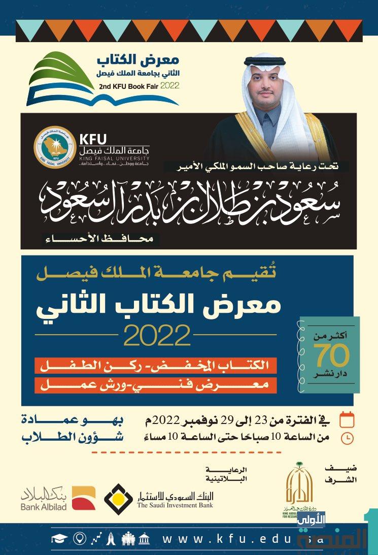 تحت رعاية صاحب السمو الملكي الأمير سعود بن طلال بن بدر آل سعود محافظ الأحساء تنظم جامعة الملك فيصل فعاليات معرض الكتاب للعام 2022م، في نسخته الثانية الذي يعد الأول من نوعه على مستوى المنطقة الشرقية بمشاركة أكثر من 70 دار نشر وبمشاركة مميزة لضيف الشرف دارة الملك عبدالعزيز وذلك خلال الفترة ما بين 23-29 /11 /2022م، في بهو عمادة شؤون الطلاب بالجامعة.