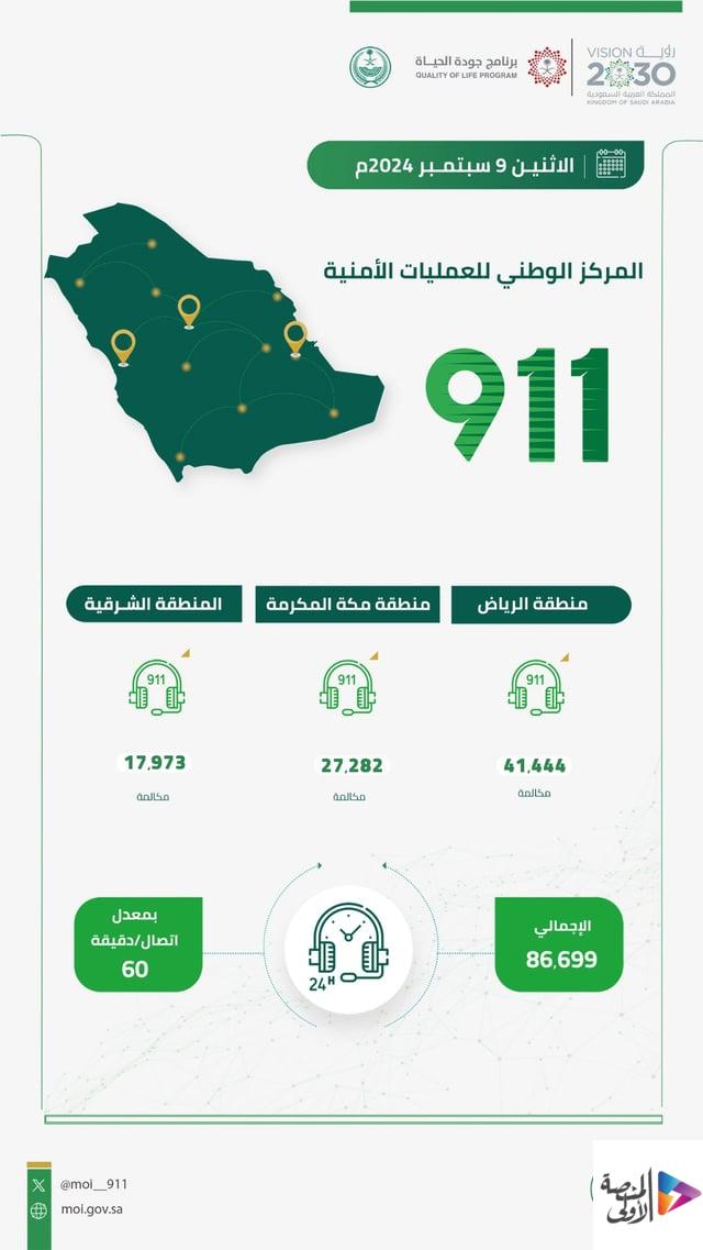 تلقى المركز الوطني للعمليات الأمنية “911”، التابع لوزارة الداخلية، أمس الاثنين، 86699 مكالمة، بمعدل 60 اتصالًا في الدقيقة.