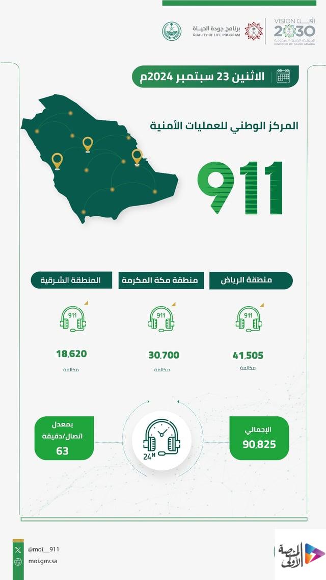 تلقّى المركز الوطني للعمليات الأمنية، أمس الاثنين، 90825 مكالمة، بمعدل 63 اتصالًا في الدقيقة.