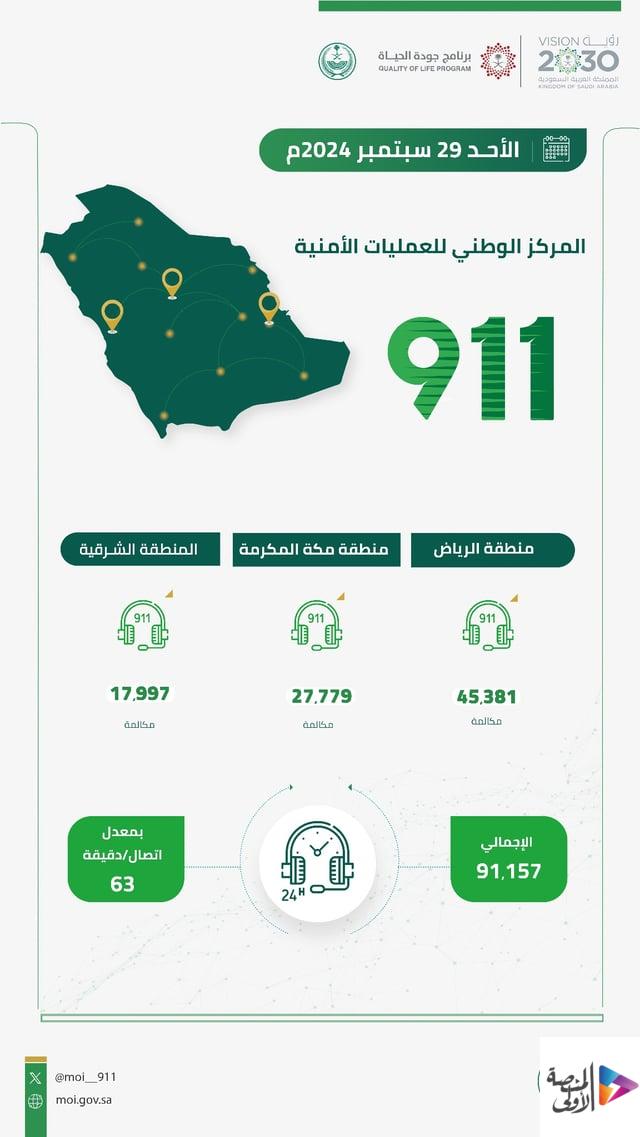 تلقّى المركز الوطني للعمليات الأمنية “911”، يوم أمس، 91157 مكالمة، بمعدل 63 اتصالًا في الدقيقة.