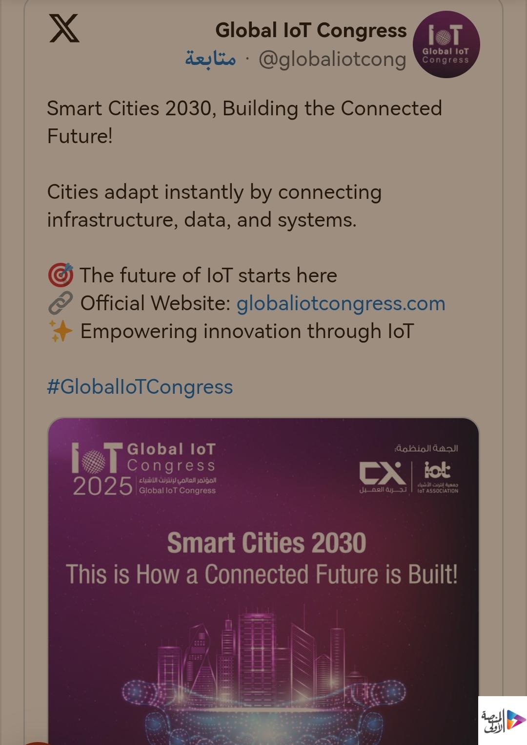 تستضيف العاصمة السعودية الرياض خلال الفترة من 21 إلى 23 أكتوبر 2025 فعاليات المؤتمر العالمي لإنترنت الأشياء (GIoTC 2025)، بمشاركة ممثلين من أكثر من 60 دولة، ليكون منصة عالمية لعرض أحدث الابتكارات في تقنيات إنترنت الأشياء وتسليط الضوء على دورها في دعم مستهدفات رؤية المملكة 2030.