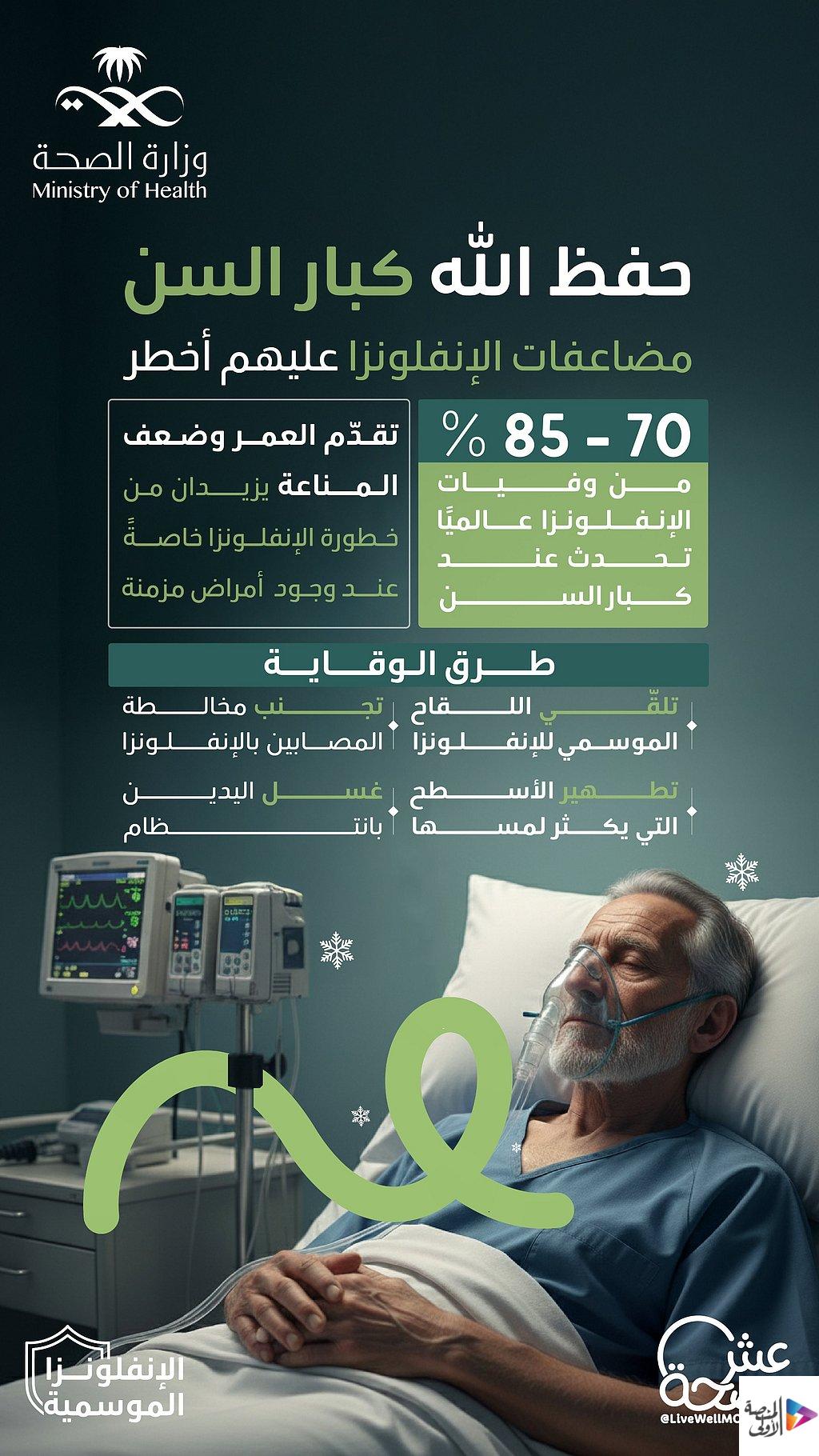 دعت وزارة الصحة عبر منصتها التوعوية “عش بصحة” إلى ضرورة حماية كبار السن من مضاعفات الإنفلونزا الموسمية، التي تُعد من أشد الأمراض فتكًا بهذه الفئة الغالية على قلوب الجميع.