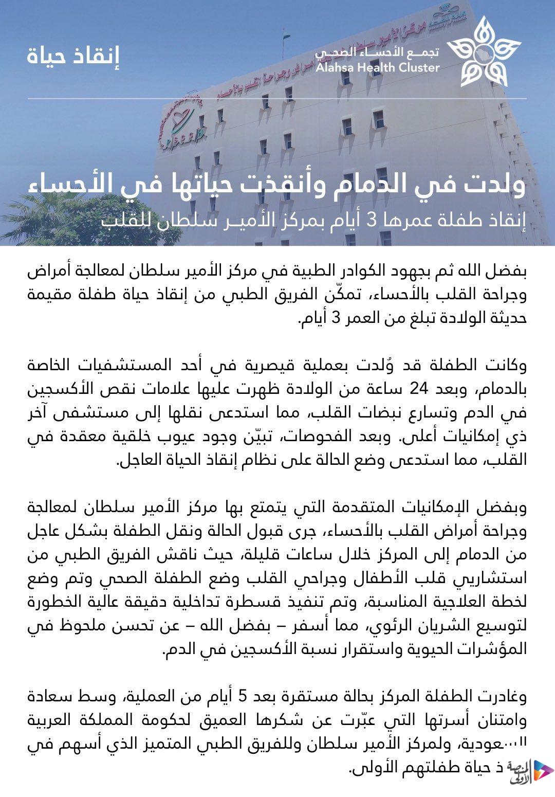 بفضل الله ثم بجهود الكوادر الطبية في مركز الأمير سلطان لمعالجة أمراض وجراحة القلب بالأحساء، تمكّن الفريق الطبي من إنقاذ حياة طفلة مقيمة حديثة الولادة تبلغ من العمر 3 أيام.