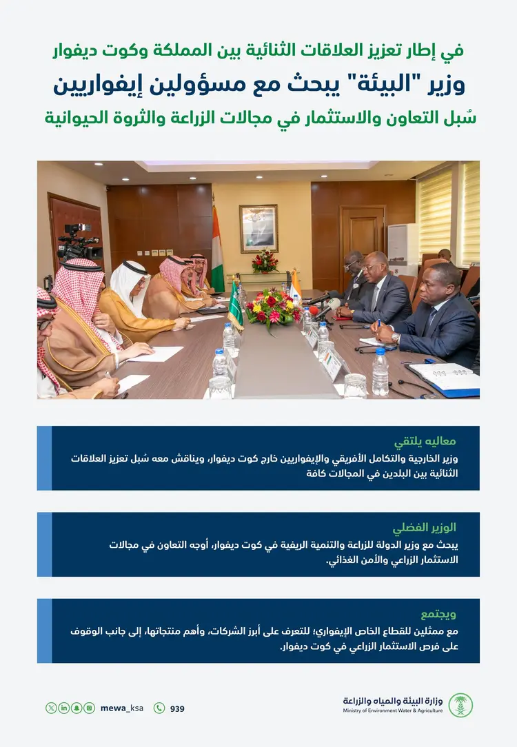 وزير “البيئة” يبحث مع مسؤولين إيفواريين تعزيز فرص الاستثمار في الزراعة والثروة الحيوانية