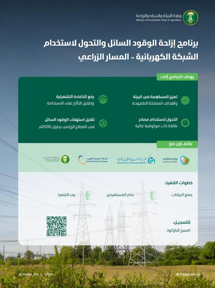 “البيئة” بالتعاون مع منظومة الطاقة تطلق خدمة إيصال الشبكة الكهربائية في منصة “نما” ضمن مسار القطاع الزراعي في برنامج إزاحة الوقود السائل